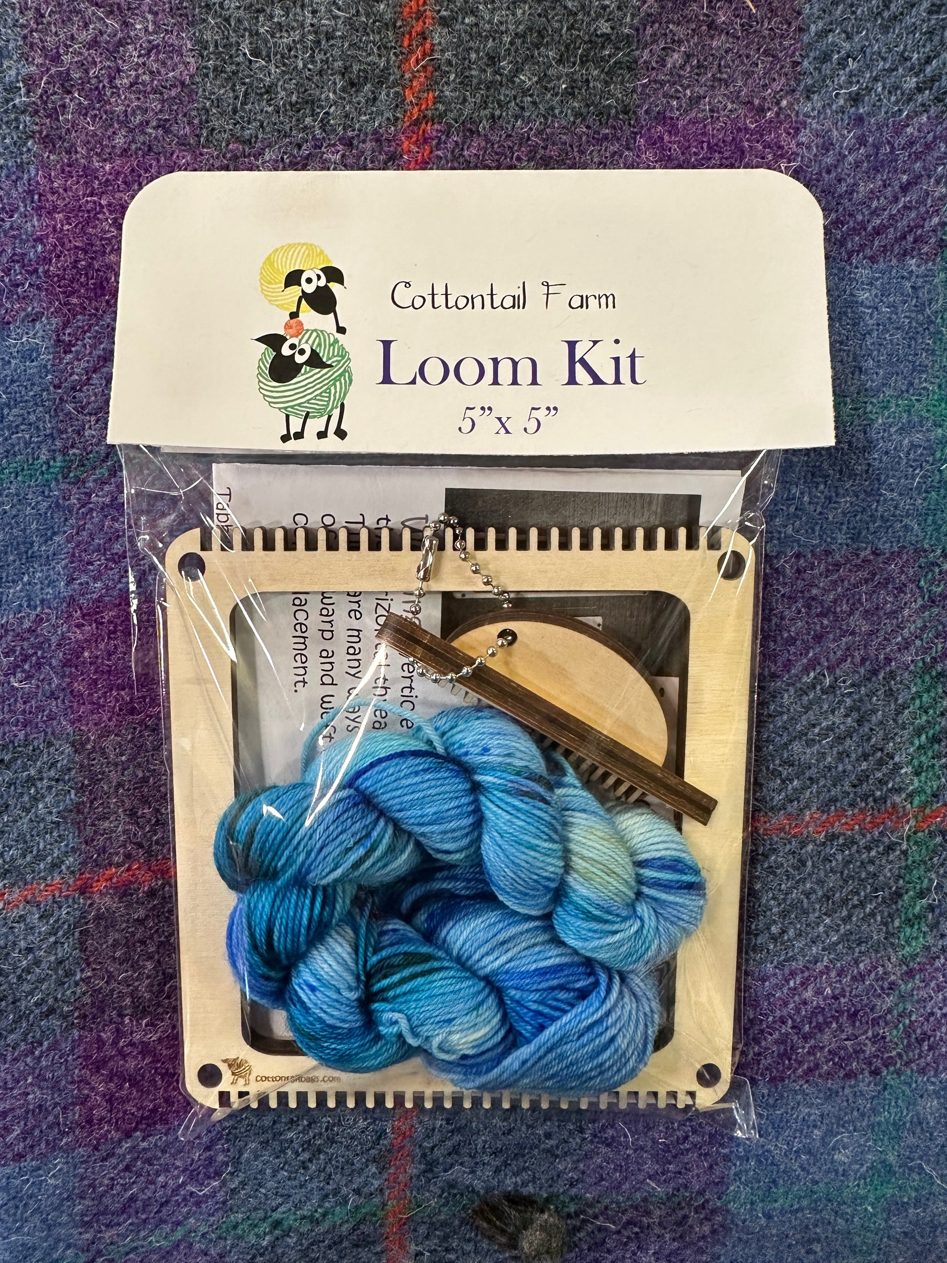 This kit includes a loom, brief directions, a comb, needle and a 20gram mini skein of hand dyed fingering weight wool yarn.