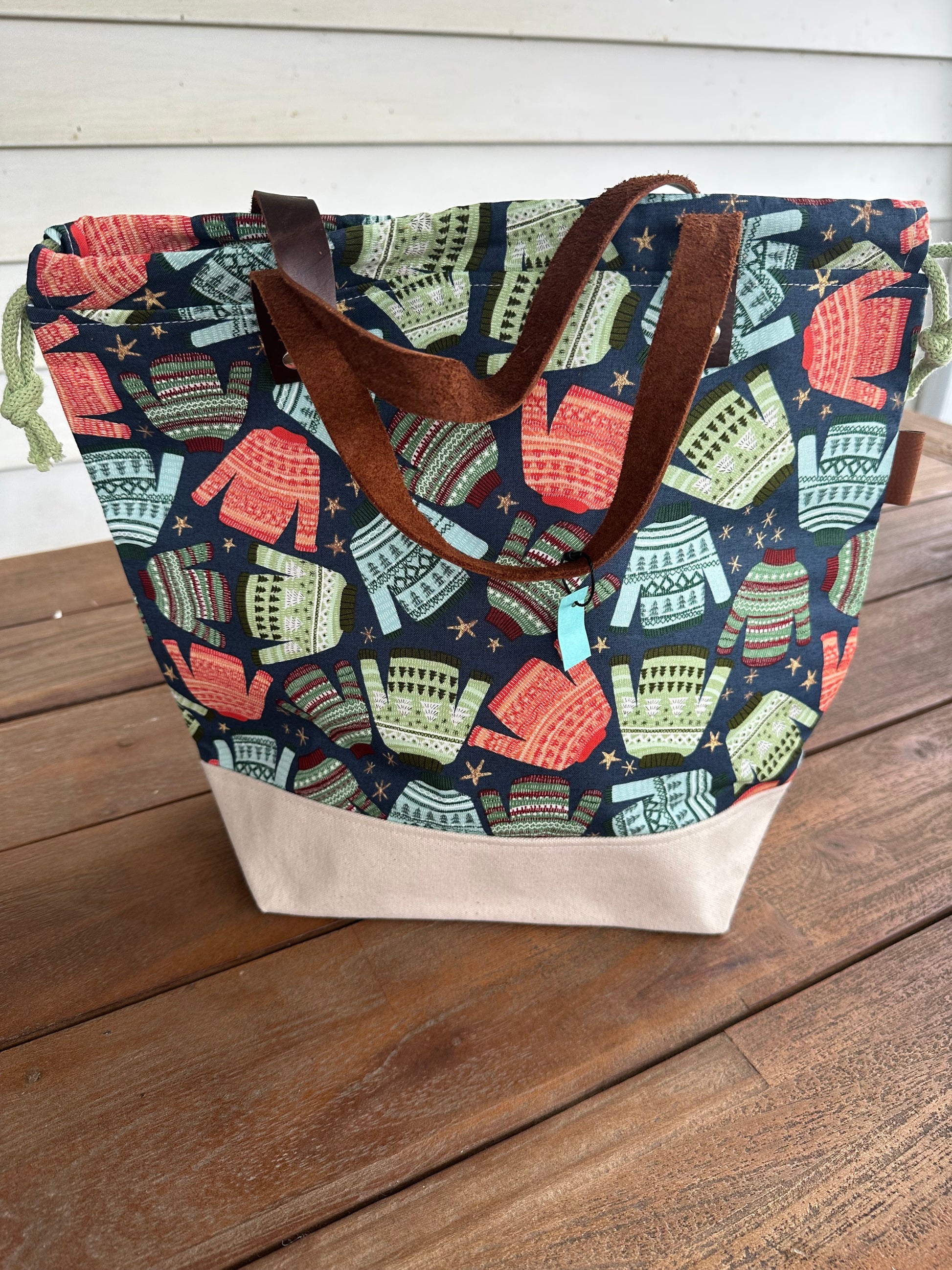 Double leather handled drawstring tote. Large enough for a 3-5 skein project.