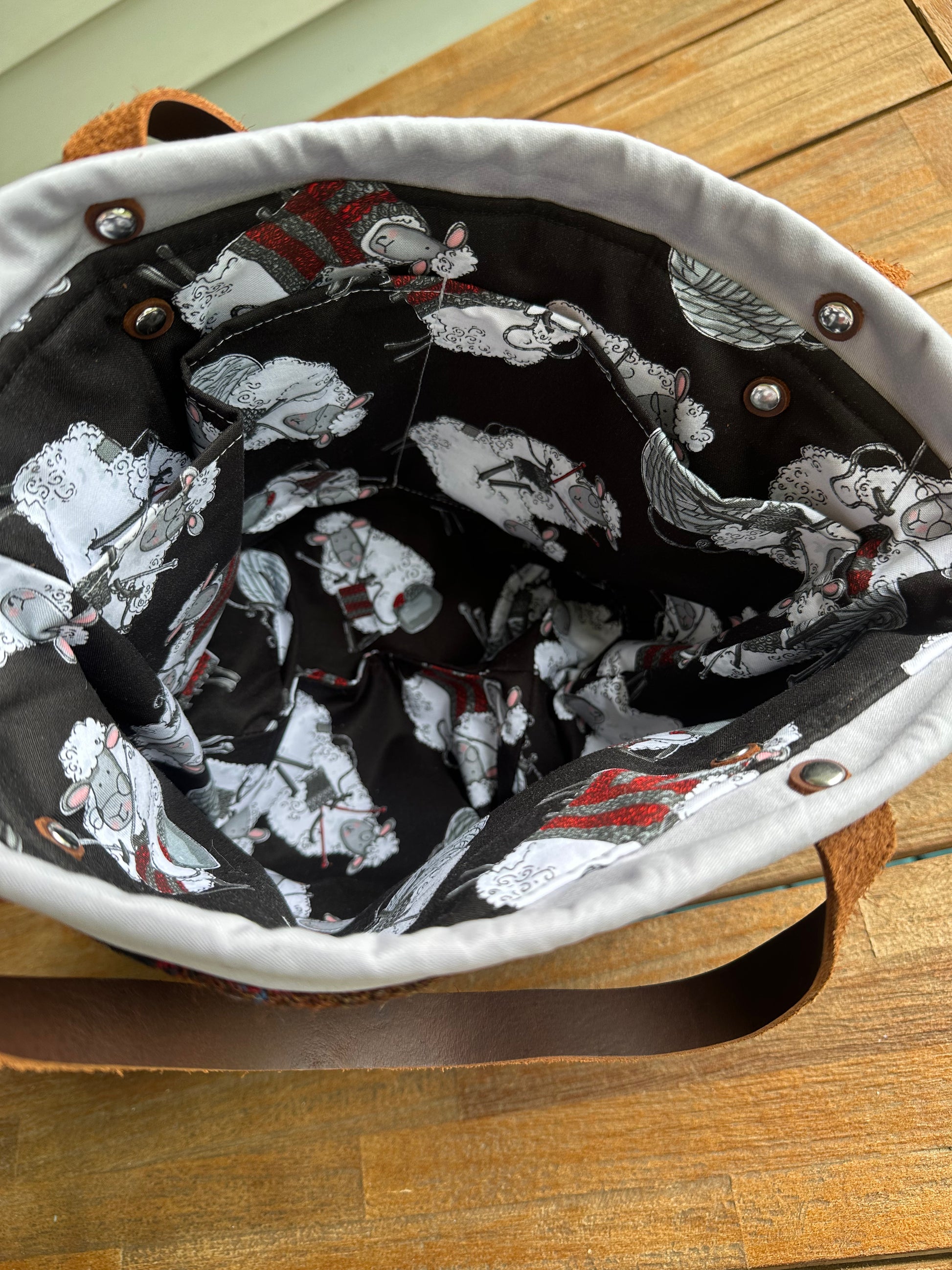 While fully interfaced to provide stability the bag can be folded flat while not in use. Wide bottom, large enough to hold at least 4, (100 gram) skeins plus your project.