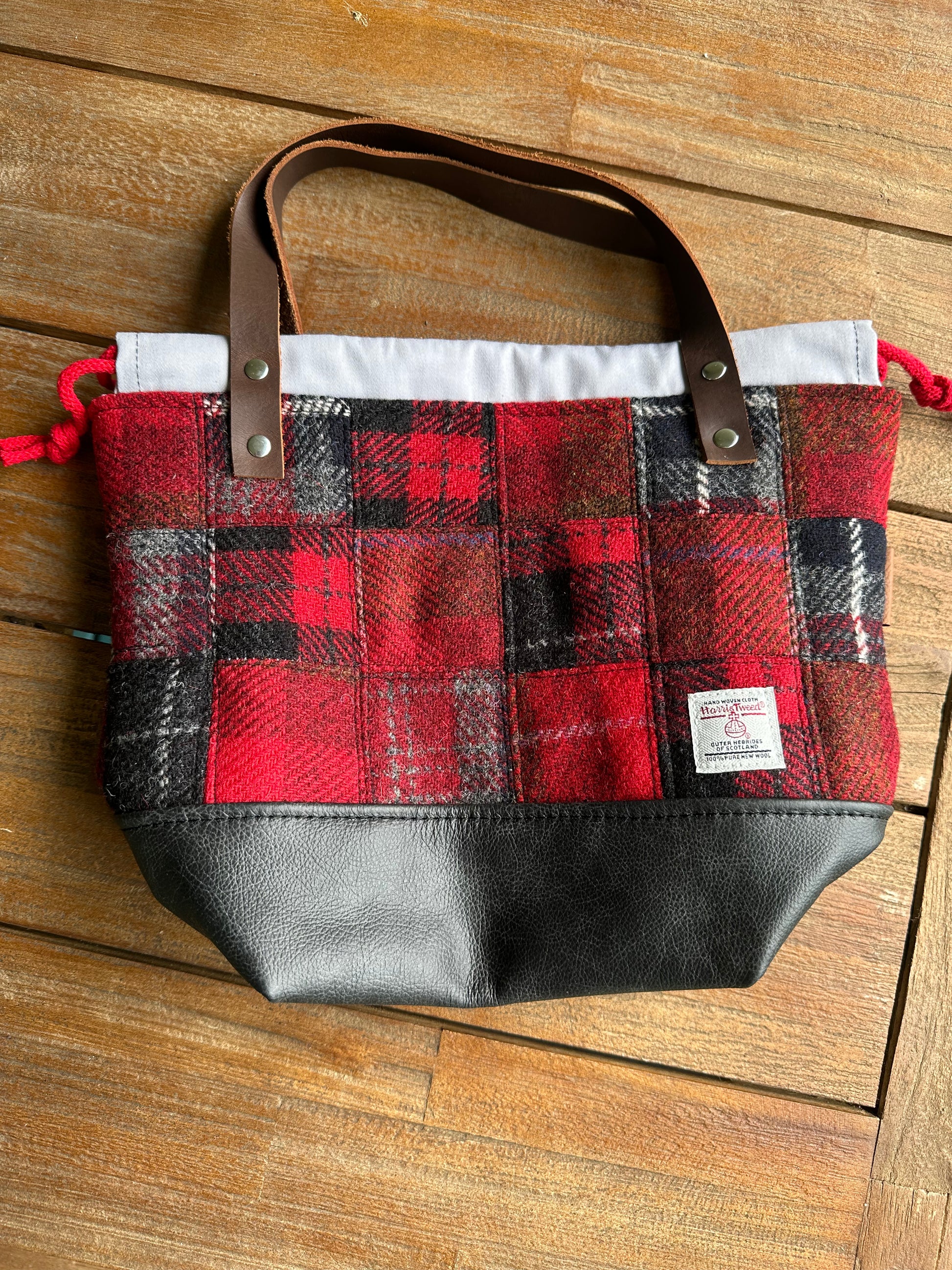 A happy collection of multiple Harris Tweed fabrics sewn into a patchwork bag!
