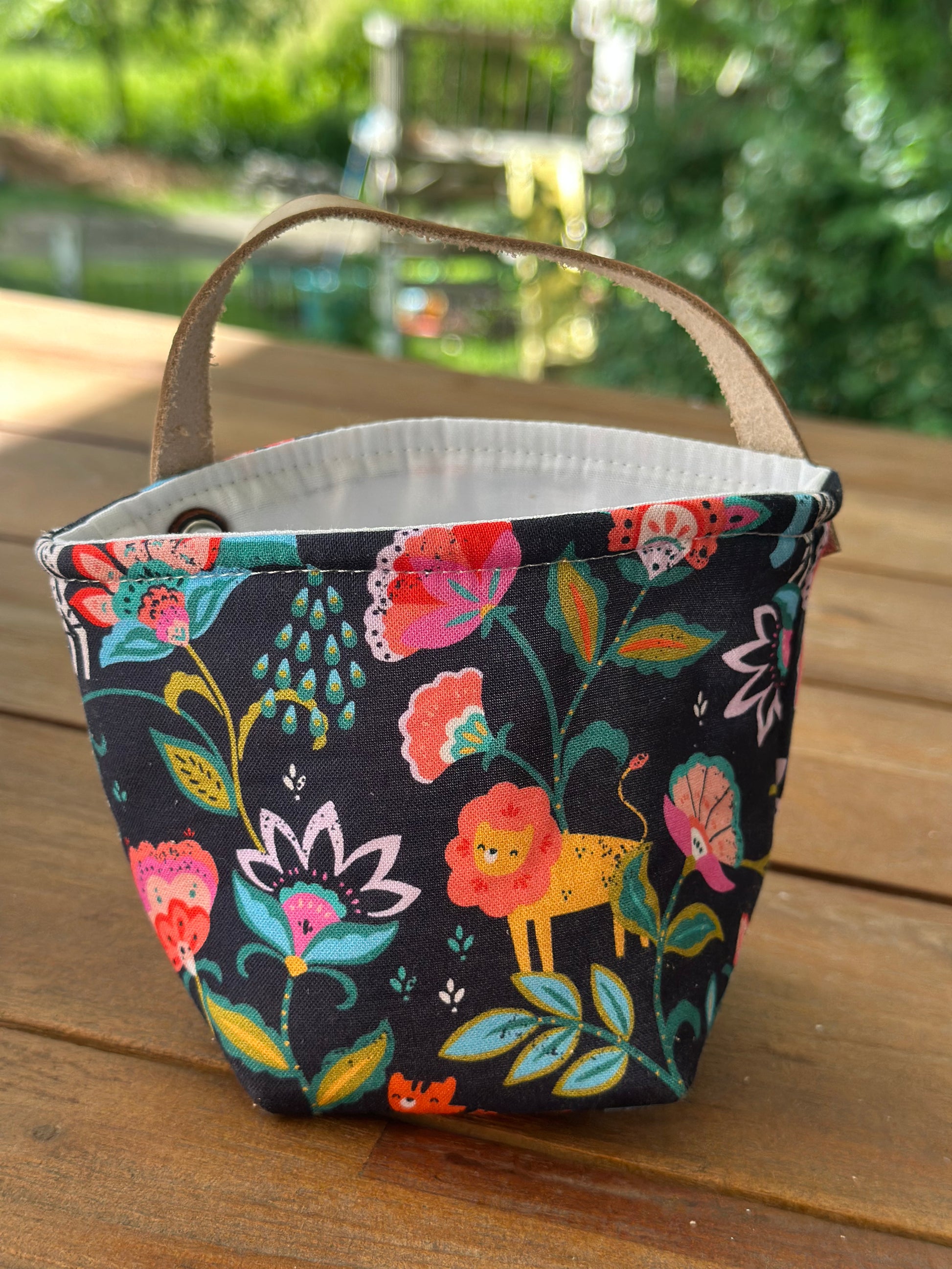 Hang the bag right on your spinning wheel. The leather strap snaps opens so you can hang it anywhere. Great for a small amount of fiber, your hook, small oil bottle, spinning gauge, or even candy!