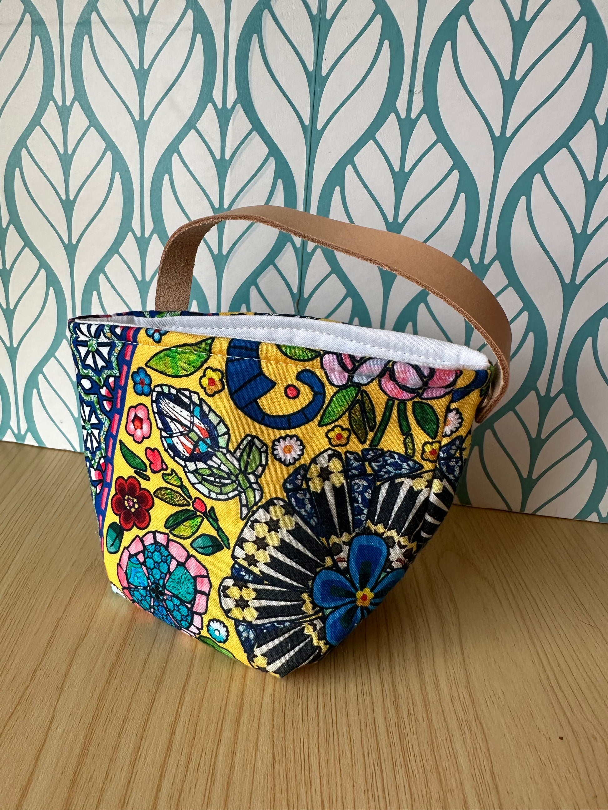 Hang the bag right on your spinning wheel. The leather strap snaps opens so you can hang it anywhere. Great for a small amount of fiber, your hook, small oil bottle, spinning gauge, or even candy!