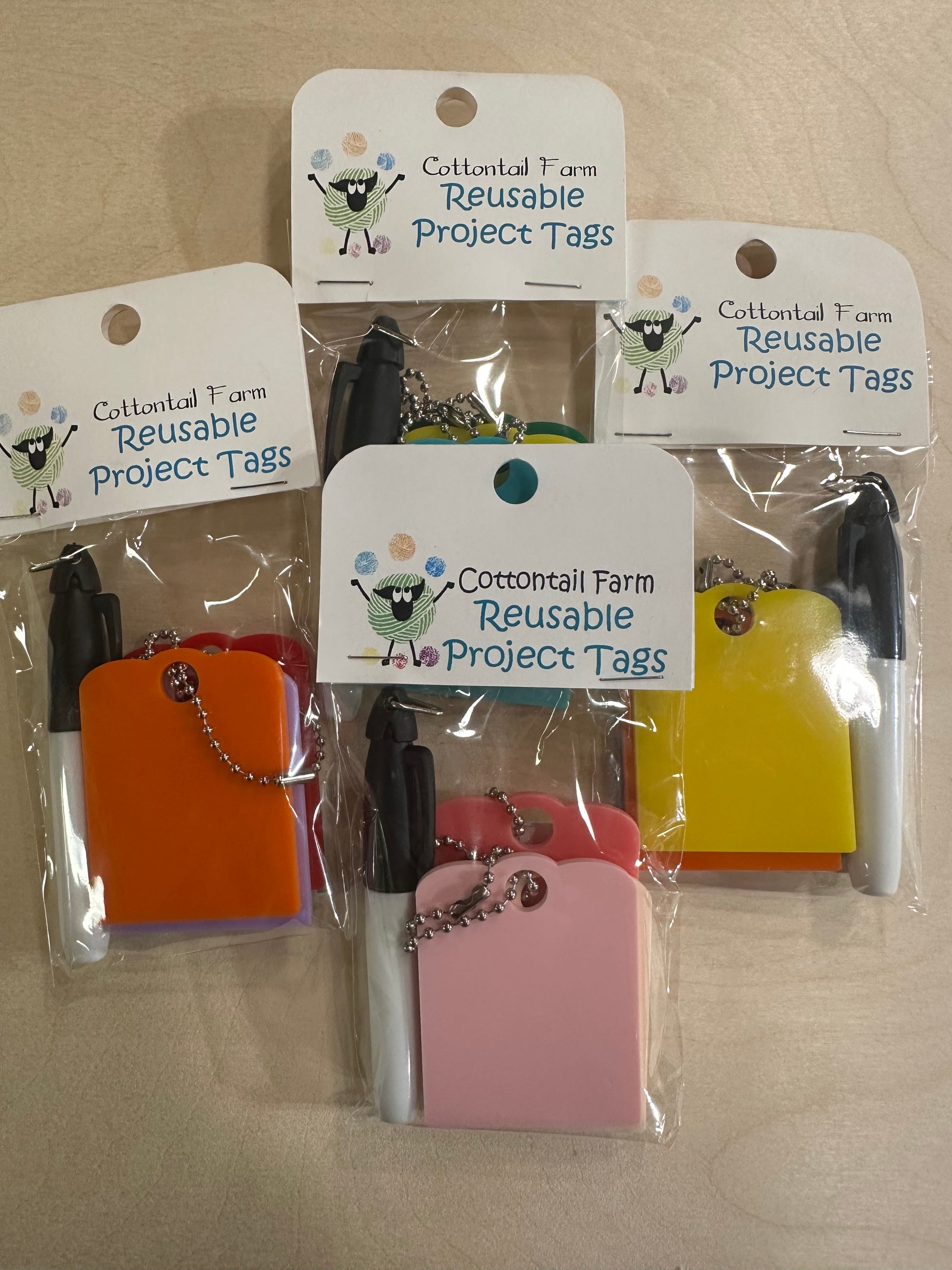 Each has a ball chain to attach to your current project bag. Using a permanent marker to label the contents. Simply use an alcohol wipe to reuse the tag .