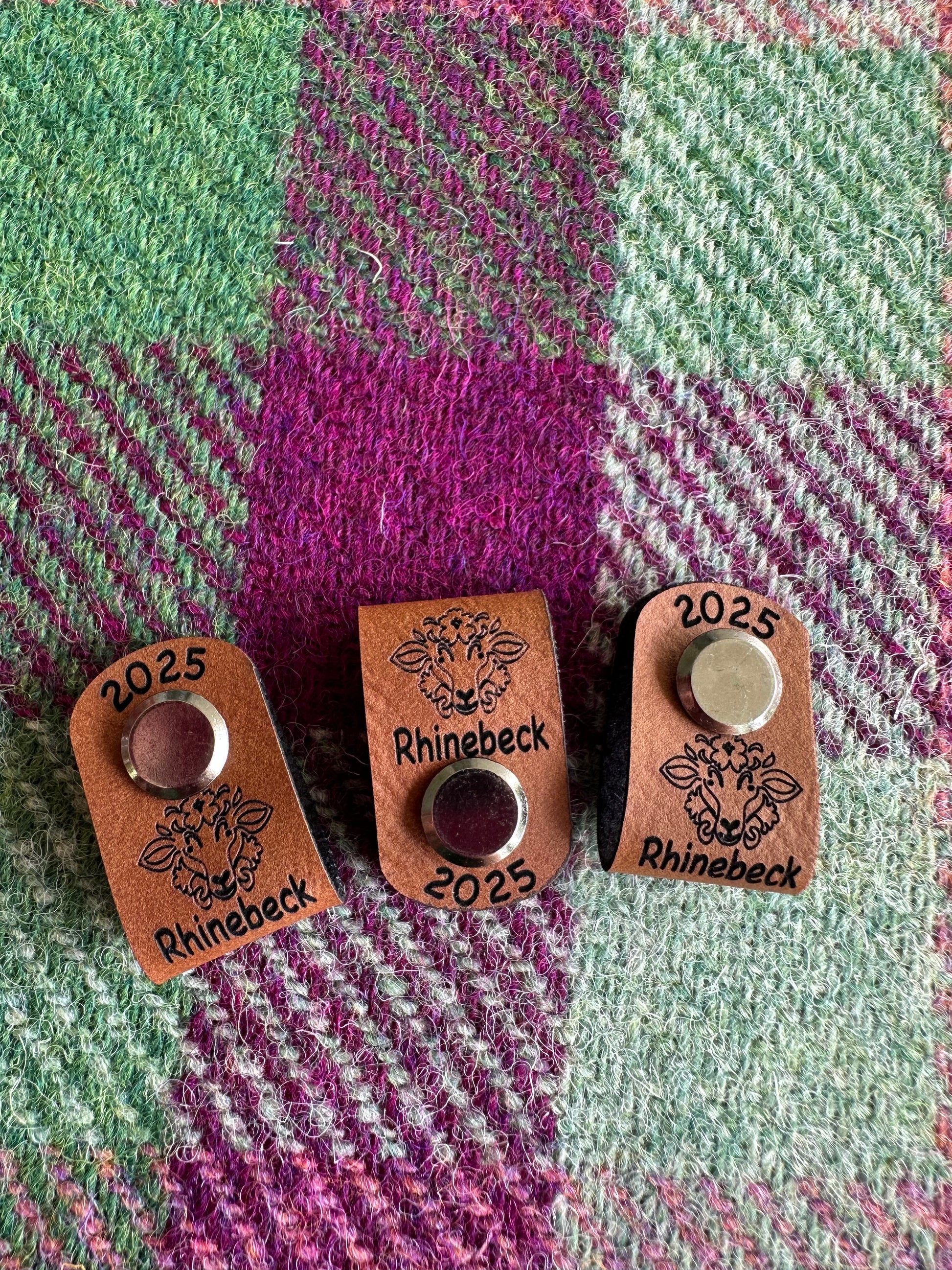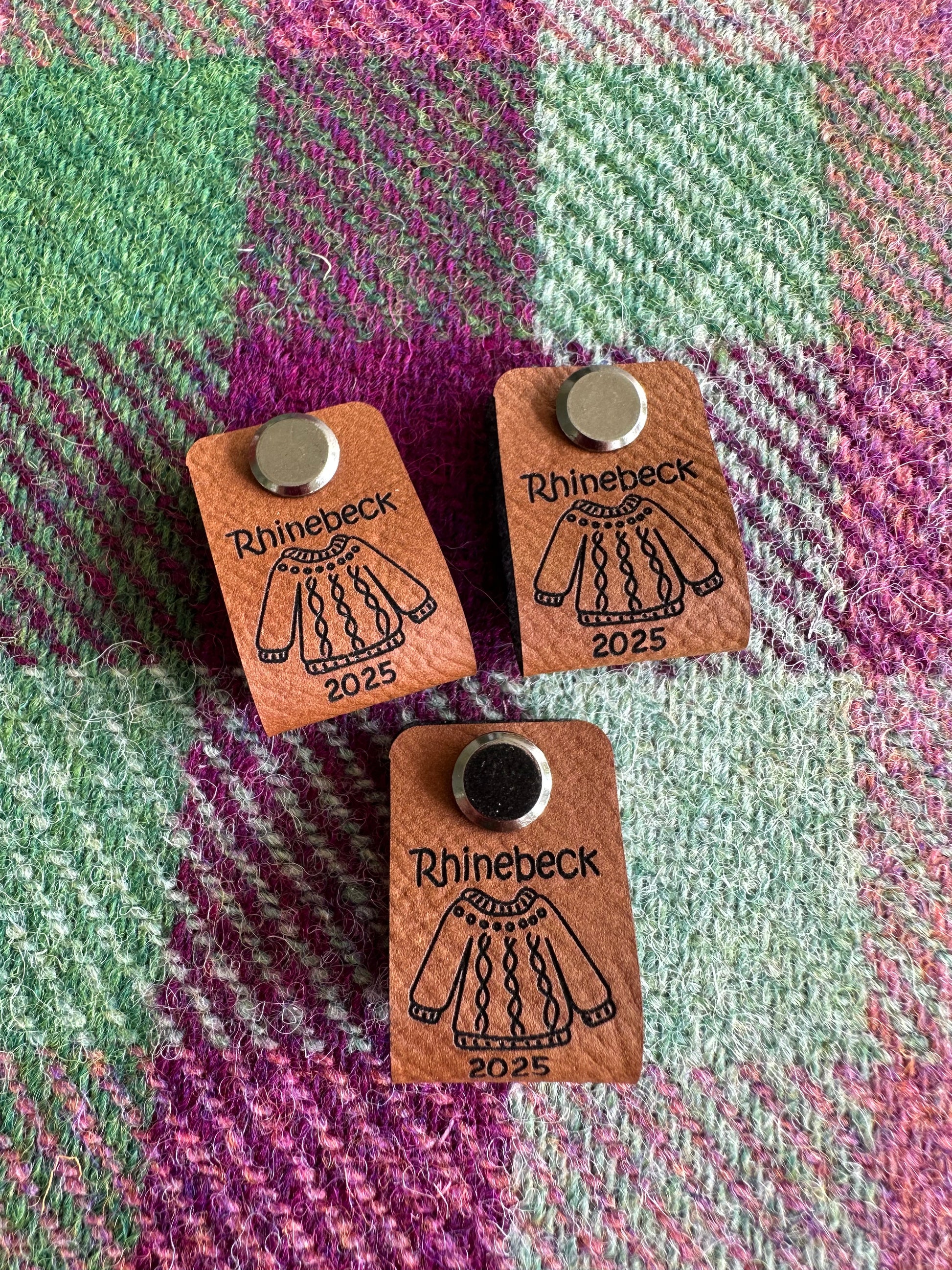 * Single 2025 Rhinebeck Sweater faux leather foldover tag. The rivet screws on and off for easy removal for washing your garment