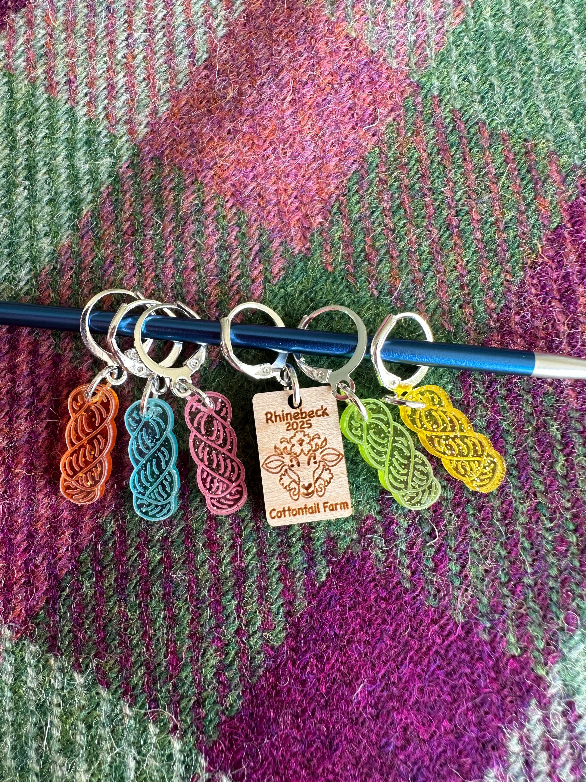 *Set of 6 Stitch markers 1 Wood dated and 5 colorful acrylic designed to look like yarn skeins.