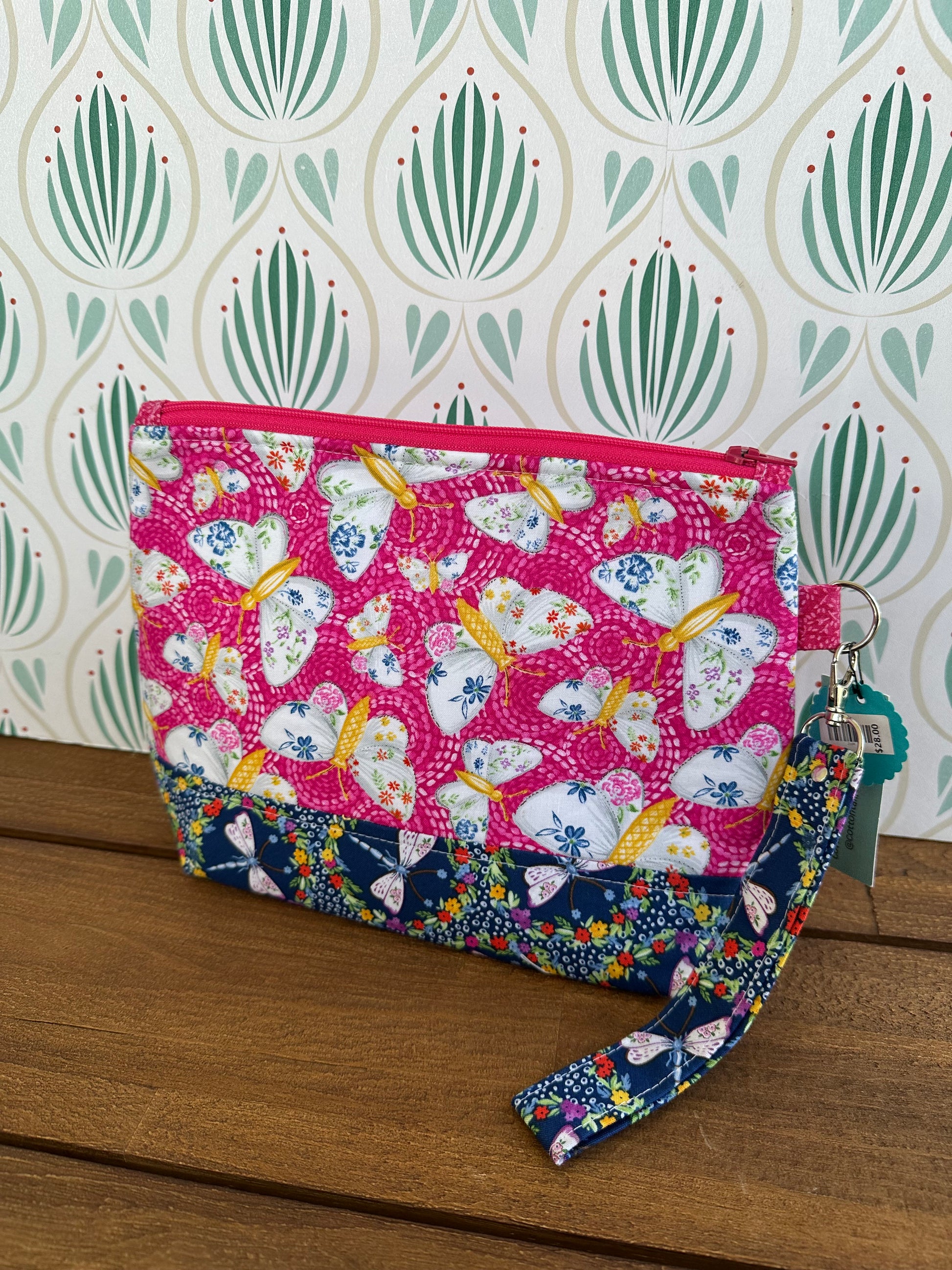 Each bag is fully lined . The zipper has been top stitched in coordinating colors. The wrist strap is detachable and can be used for storing stitch markers or add to your keys when not in use. The strap is also on the opening side of the bag for easy opening when carrying the bag.